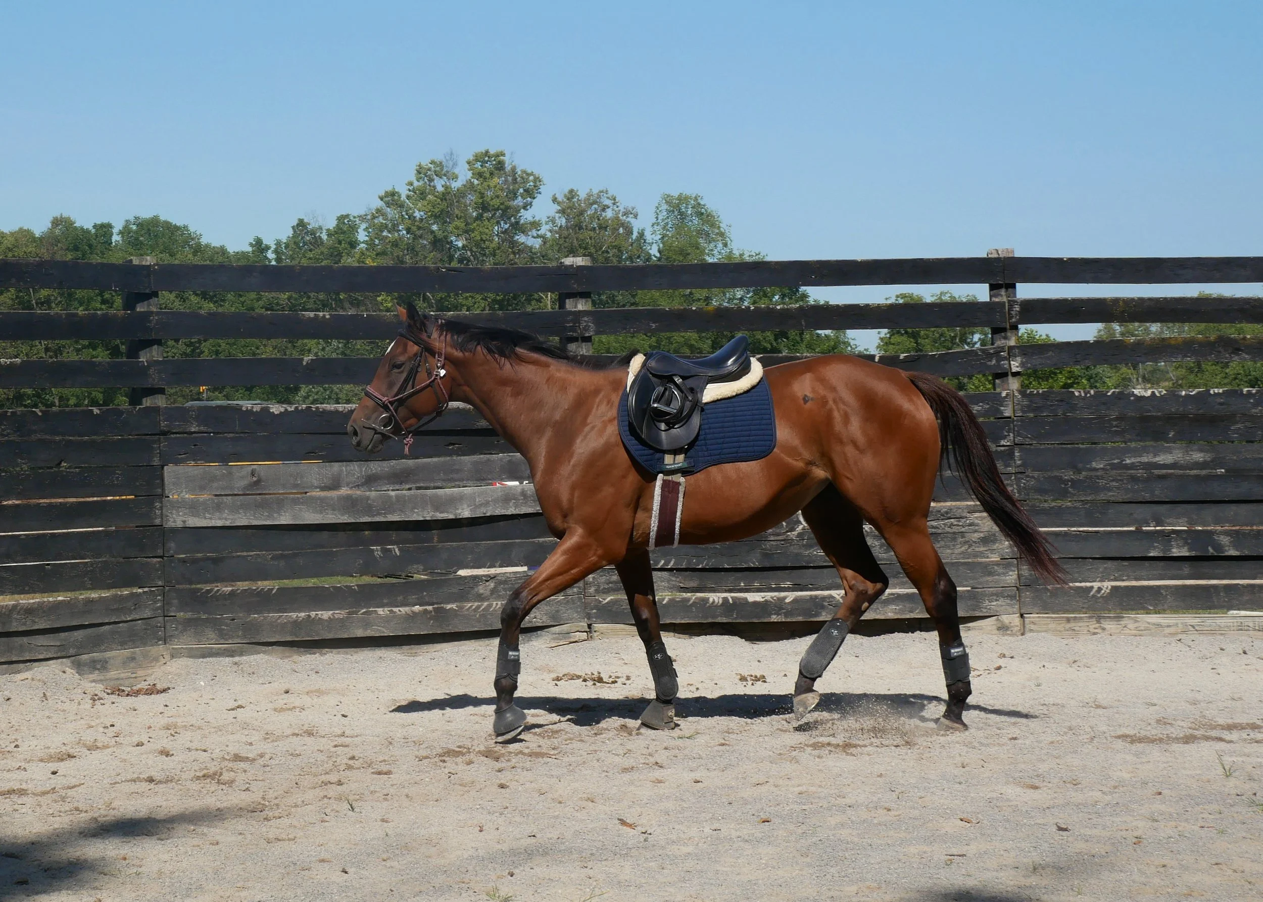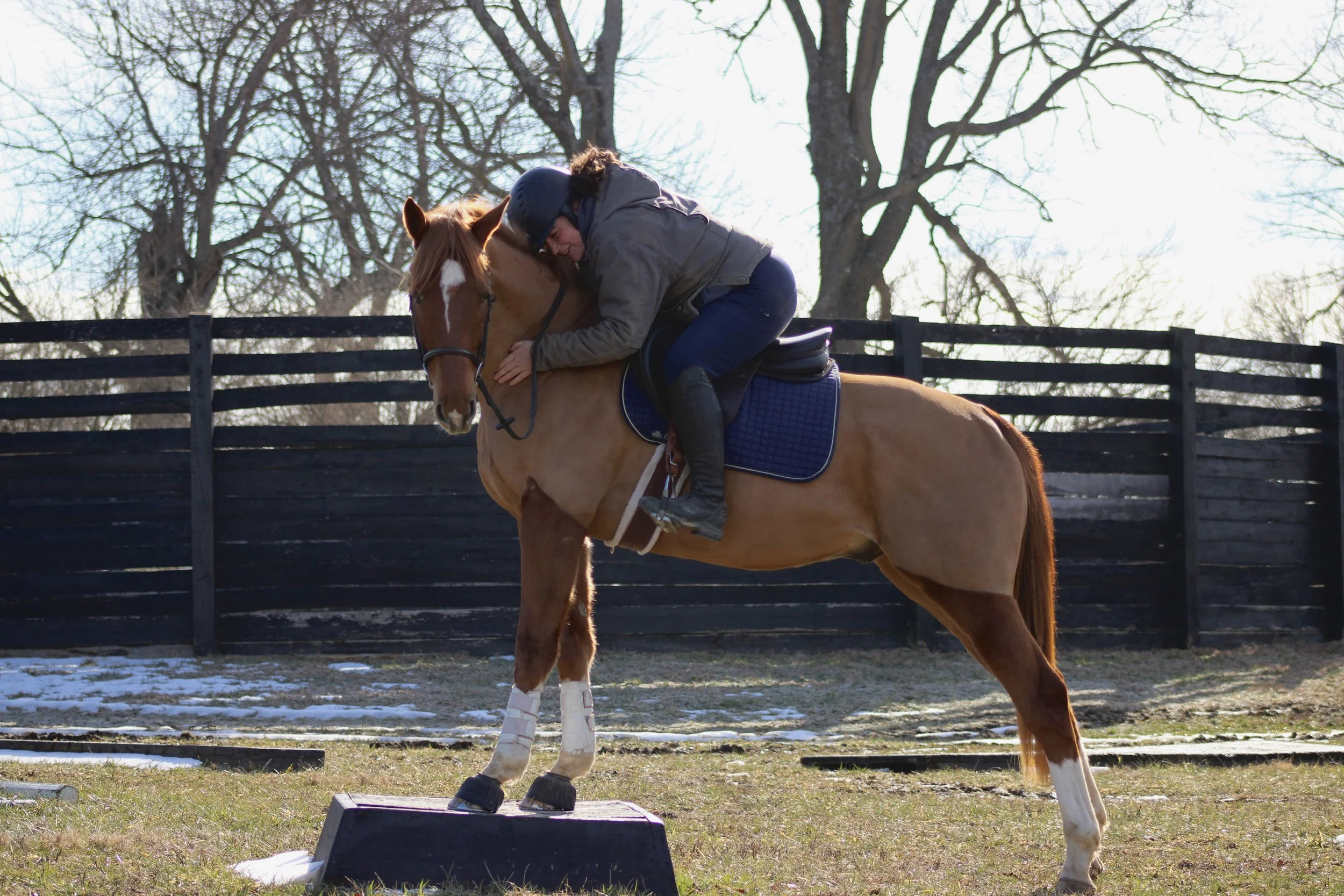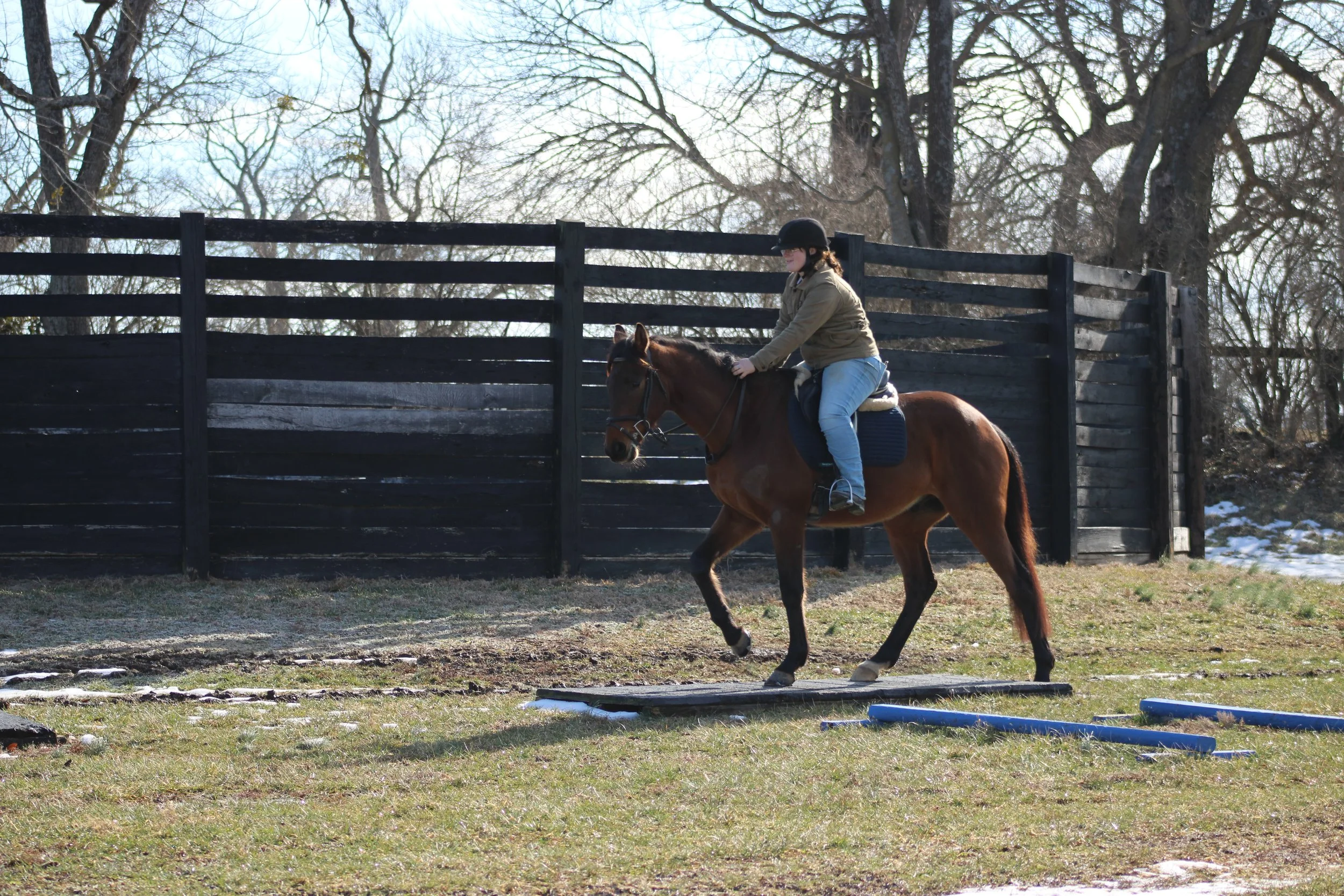 In addition to their groundwork, horses are introduced to obstacles, mounting blocks, cross-ties, and trailering. Our facility features a small cross-country course and path for trail rides. Some even participate in small shows and clinics off-property.
