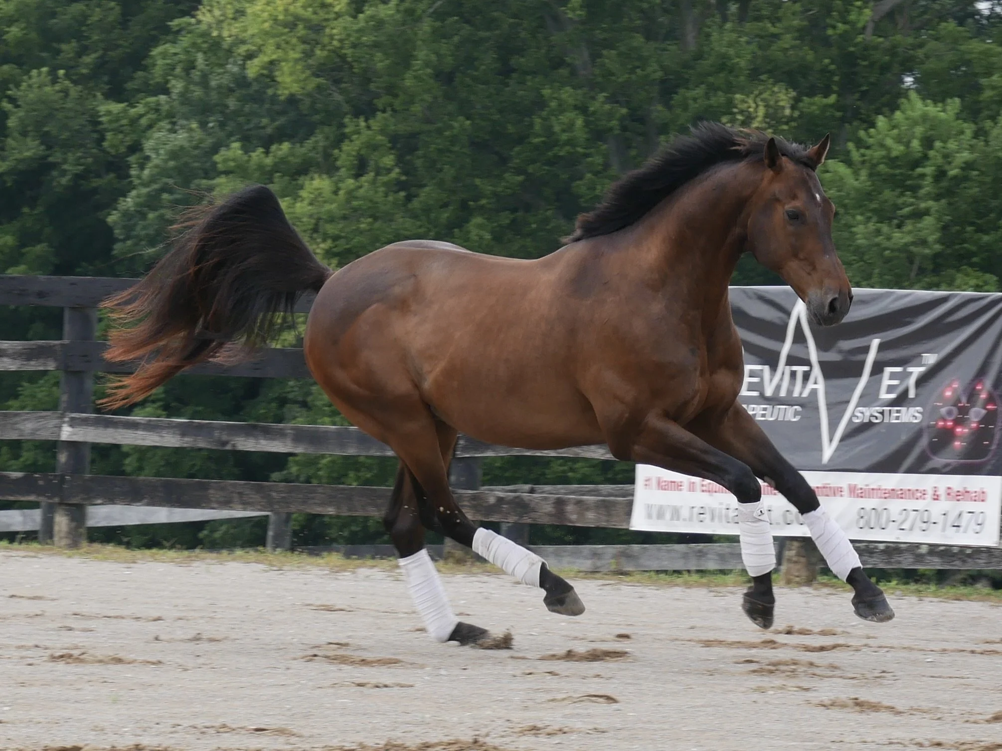 Aria is easy to work with on the ground and is very curious under saddle. She is steady but not strong in the bridle and responsive (but not sensitive) to leg contact. She wants to work, but requires leg and direction. She would make a very suitable foxhunter, eventer, or show hunter. She has all the athleticism, work ethic, and brain to be a competition horse, and at her age she is ready to be started in any direction.